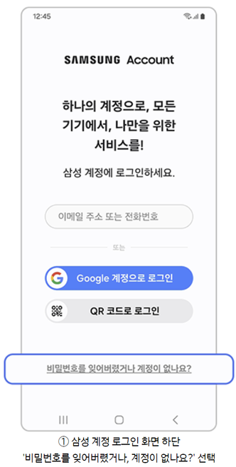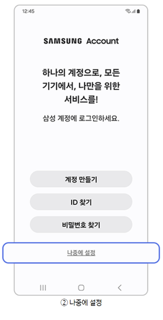 [삼성 계정 로그인 화면 하단 '비밀번호를 잊어버렸거나, 계정이 없나요?' 선택 > 나중에 설정]