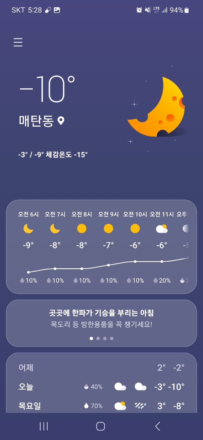 위 사진은 12월 14일 새벽 5시 28분입니다. 체감온도가 영하 15도입니다. 신발 1 치수 크게 구매하고 우레탄 깔창과 겨울용 깔창 깔고 사용 중입니다. 춥긴 하지만 전에 운동화 신었을 때만큼 발 시림은 없습니다.