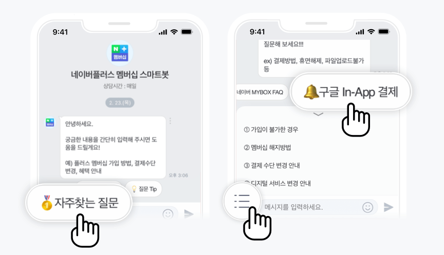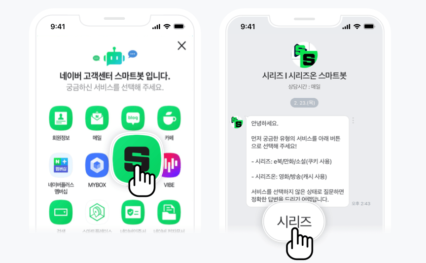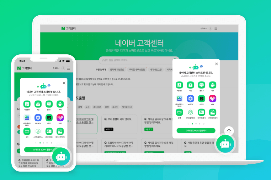 365일, 24시간 네이버 서비스를 더 편리하게 이용할 수 있도록 네이버 스마트봇을 이용하여 문의 가능합니다.