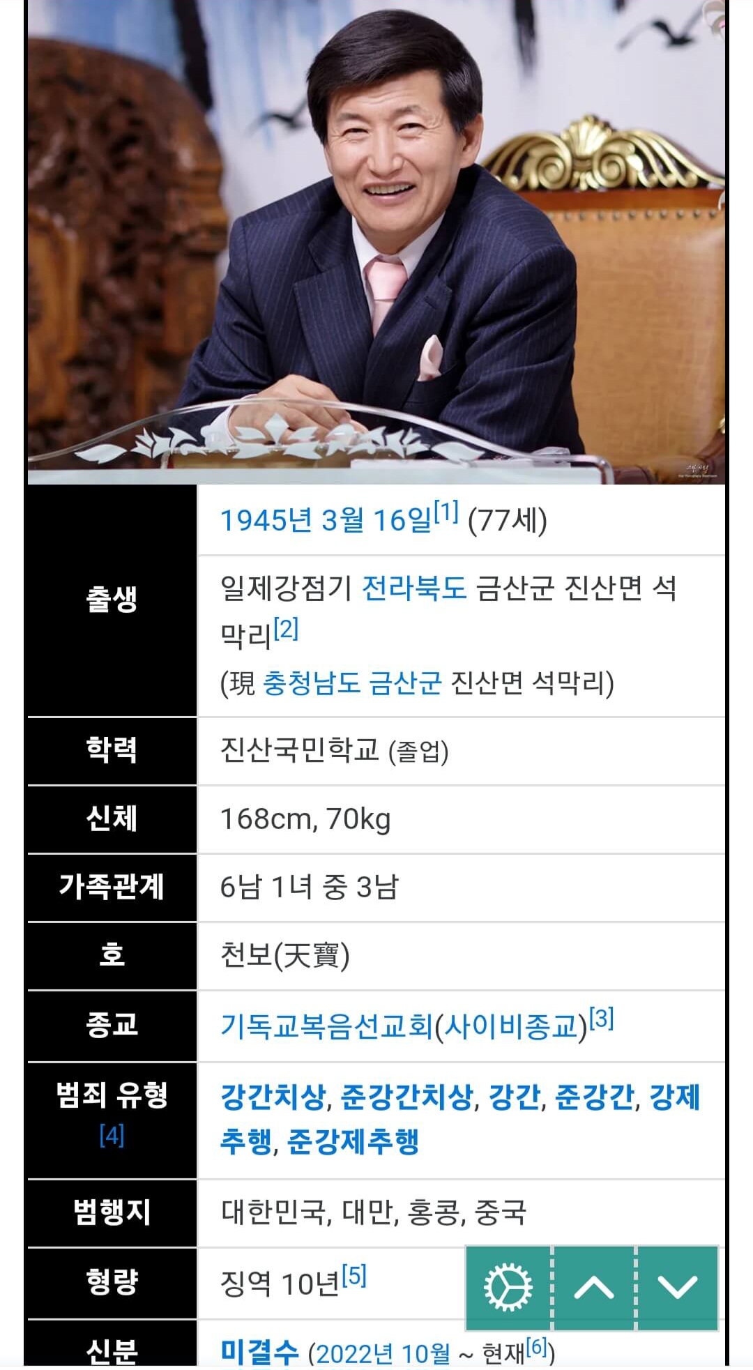키크고 예쁜 신도들을 세뇌해서 수십년간 국제적으로 성인 여성 및 미성년자를 대상으로 강간치상·준강간치상·강간·준강간·강제추행·준강제추행·추행목적 약취 유인을 했고, 해외도피 중에도 수많은 범죄로 인터폴 적색수배가된 범죄자가 되었다.