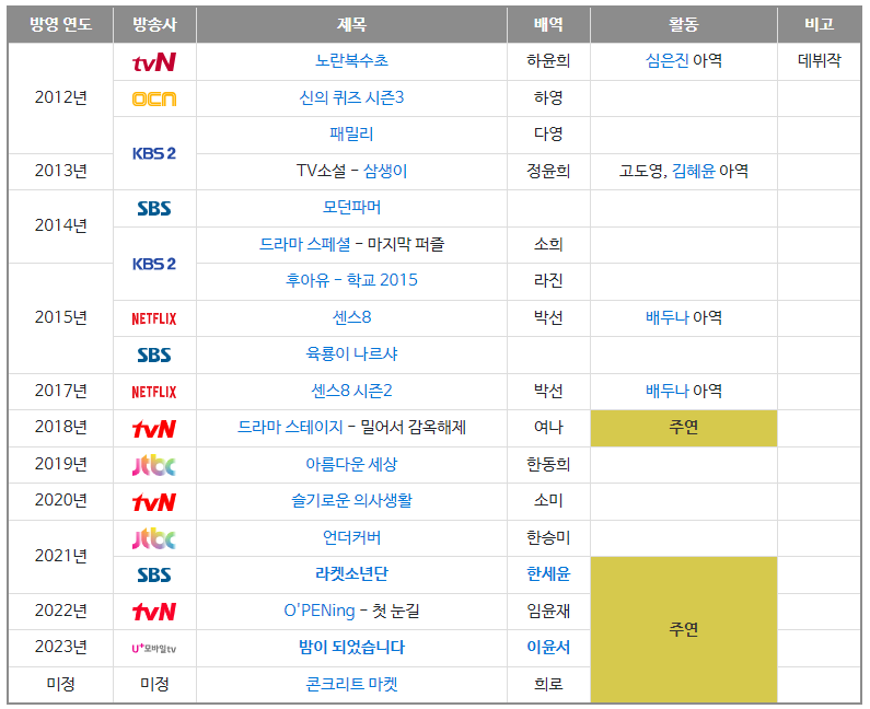 - 데뷔: 2012년 tvN 드라마 《노란복수초》
