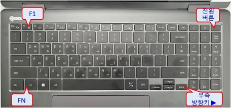 - [Fn] + [F1] + 우측 방향키(▶)를 동시에 누른 상태에서 전원 버튼을 누릅니다.