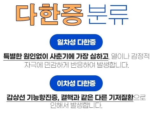 그리고 특별한 원인 없이 긴장을 하거나 일에 집중을 했을 때 땀을 흘리게 경우를 '일차성 다한증'이라고 하고 심장 질환이나 결핵이 있을 때 땀을 많이 흘리는 경우를 '이차성 다한증'이라고 합니다.