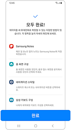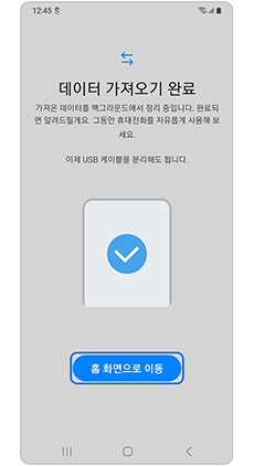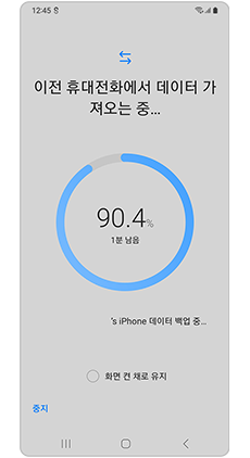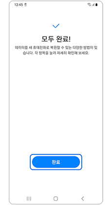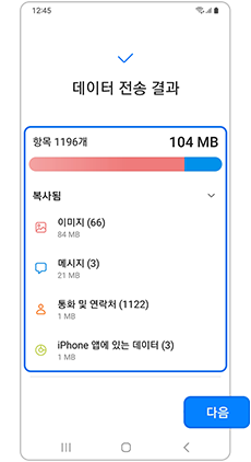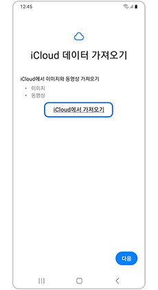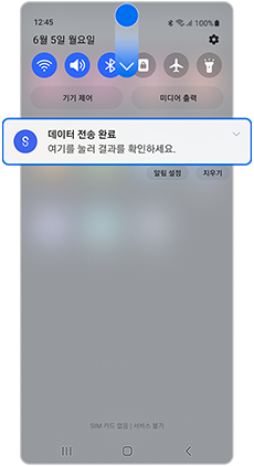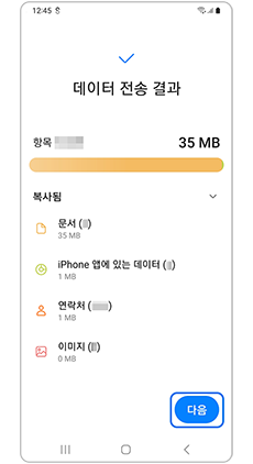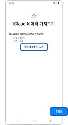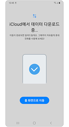 - 알림창을 내려, 데이터 전송 완료 알림 선택 > 데이터 전송 결과 확인 및 다음 선택 > iCloud 데이터 가져오기 확인 및 다음 > 모두 완료