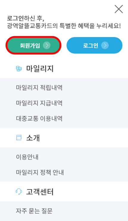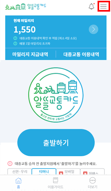 2. 구글 플레이 스토어, 앱스토어, 원스토어에서 알뜰교통카드 앱 검색 후 설치하고 알뜰교통카드 앱을 실행하여 우측 위에 '줄 3개' 부분을 누른 후 회원가입 진행