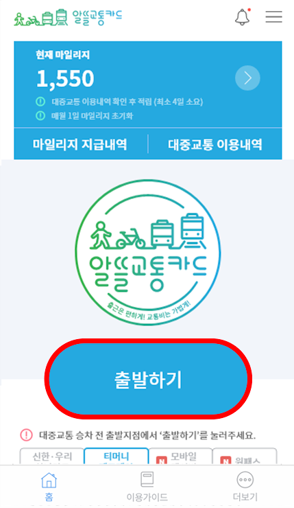 지자체에서 적립해 주는 알뜰교통카드 마일리지는 대중교통 타기 전후, 800미터 이상 걷거나 자전거로 이동 시 교통요금 지출 구간별 적립액을 100% 받을 수 있는데요.