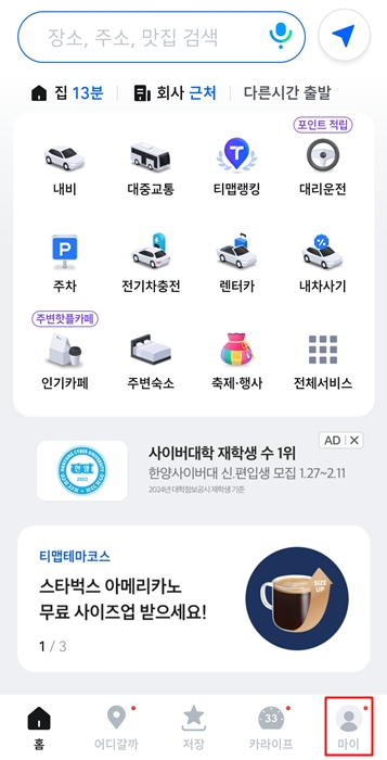 1. 티맵 앱을 실행하고 오른쪽 하단 [마이]를 클릭합니다.