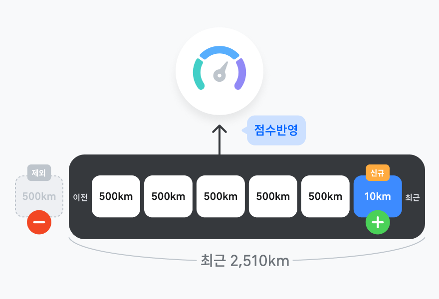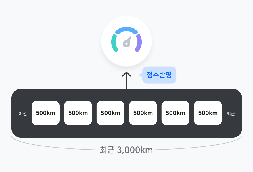 - 주행 거리: 최근 500km 단위로 구간을 나누어 점수를 계산하며, 주행 거리가 길수록 점수에 미치는 영향이 커집니다.