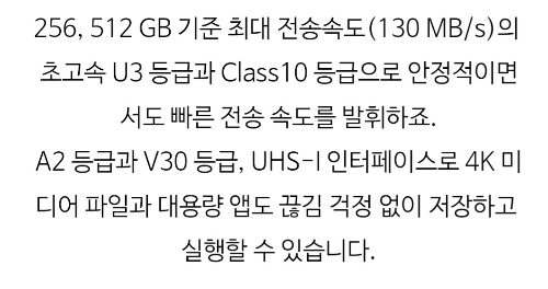 제품 관련해서 검색을 해보니 용량도 64GB, 128GB, 256GB, 512GB가 있으며, 기존 제품보다 읽기 속도가 30% 빨라졌고, 핸드폰으로 동영상 촬영 시 고해상도로 촬영해도 저장공간에 문제가 없다고 합니다.